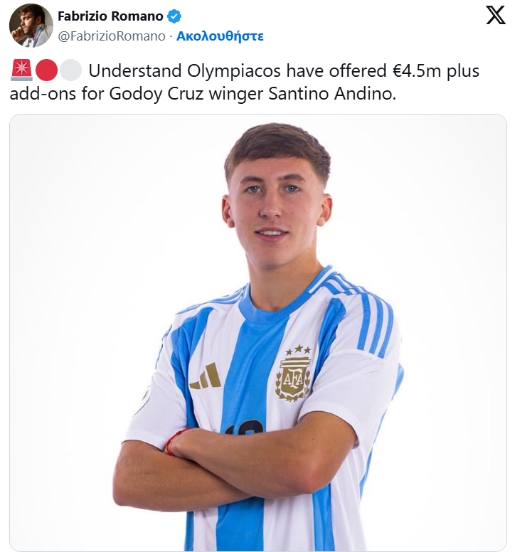 Το ρεπορτάζ της εφημερίδας SPORTDAY για τον Αργεντινό εξτρέμ ήρθε να επιβεβαιώσει ο Φαμπρίτσιο Ρομάνο, ο οποίος σε ανάρτησή του αναφέρει πως οι νταμπλούχοι Ελλάδας κατέθεσαν πρόταση ύψους 4,5 εκατομμυρίων ευρώ συν μπόνους στην Γοδόι Κρουζ για τον Αντίνο.