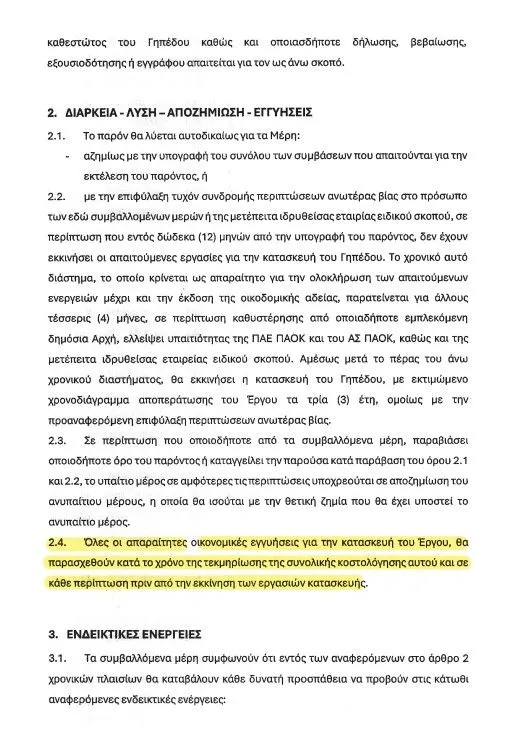 - Η ΠΑΕ ΠΑΟΚ συνέβαλε ουσιωδώς στην προετοιμασία και υποστήριξη της διαδικασίας εκπόνησης και έγκρισης του προαναφερόμενου Ειδικού Πολεοδομικού Σχεδίου (Ε.Π.Σ), μέσω της ανάθεσης και χρηματοδότησης εξειδικευμένων μελετών, αρχιτεκτονικών σχεδίων και λοιπών τεχνικών στοιχείων, τα οποία ελήφθησαν υπόψη στο πλαίσιο σύνταξης του Ε.Π.Σ. Περαιτέρω η ΠΑΕ ΠΑΟΚ έχει ήδη προβεί, με ίδια μέσα και δαπάνες, σε σειρά προπαρασκευαστικών ενεργειών που σχετίζονται με την υλοποίηση του Έργου διαμόρφωσης και κατασκευής του Γηπέδου, περιλαμβανομένων τεχνικών και αρχιτεκτονικών μελετών και συναφών υποστηρικτικών ενεργειών. Ο ΑΣ ΠΑΟΚ δηλώνει ότι συμφωνεί με την πρόταση της ΠΑΕ ΠΑΟΚ να συσταθεί εταιρεία ειδικού σκοπού της επιλογής της, για την κατασκευή και εν συνεχεία μερική εκμετάλλευση του Έργου, συμφώνως προς τις προβλέψεις της κέιμνεης νομοθεσίας. Η ΠΑΕ ΠΑΟΚ, καθώς και η μετέπειτα ιδρυθείσα εταιρεία ειδικού σκοπού, πέραν των προαναφερόμενων ήδη καταβληθέντων δαπανών, αναλαμβάνει και τις πάσης φύσεως απαιτούμενες δαπάνες για την ωρίμανση όλων των υπολειπόμενων μελετών, καθώς και τα σχετικά έξοδα όλων των αδειοδοτήσεων.