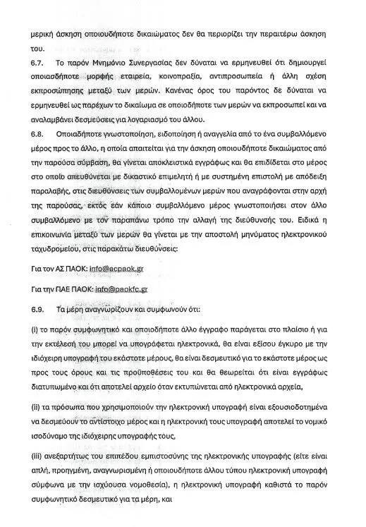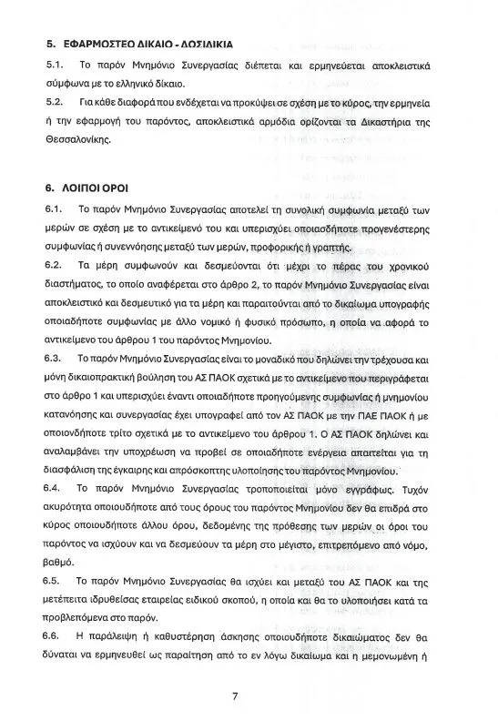 - Η ΠΑΕ ΠΑΟΚ έχοντας το αποκλειστικό δικαίωμα και τη συναίνεση του ΑΣ ΠΑΟΚ, θα υποδείξει φυσικά ή νομικά πρόσωπα της επιλογής της για τη σύσταση εταιρείας ειδικού σκοπού (η οποία εν συνεχεία θα υλοποιήσει το παρόν μνημόνιο)