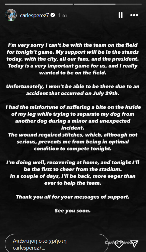 Είμαι καλά, αναρρώνω στο σπίτι, και απόψε θα είμαι ο πρώτος που θα πανηγυρίζει από την εξέδρα. Σε λίγες μέρες θα επιστρέψω, πιο δυνατός από ποτέ να βοηθήσω την ομάδα.