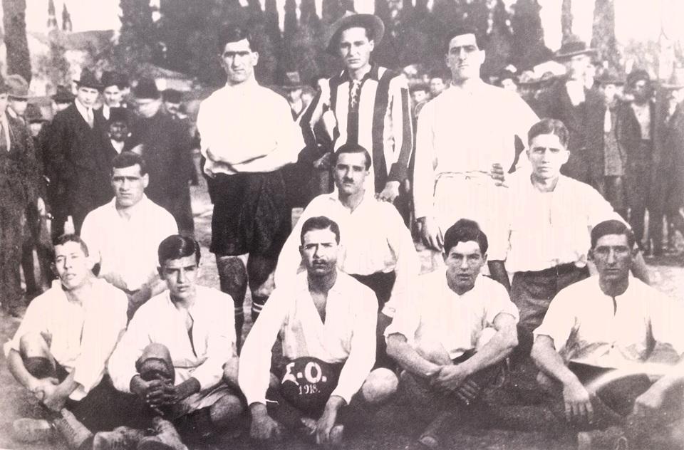 Η Μικτή ποδοσφαιρική ομάδα της Σμύρνης, παραταγμένη το 1918 στο γήπεδο του Πανιωνίου. Ο Θόδωρος Δημητρίου διακρίνεται κάτω δεξιά, ενώ ακριβώς από πάνω του ποζάρει γονατιστός ο Σοφοκλής Δεσποτόπουλος (πηγή: Αρχείο Δ. Μποντικούλη).