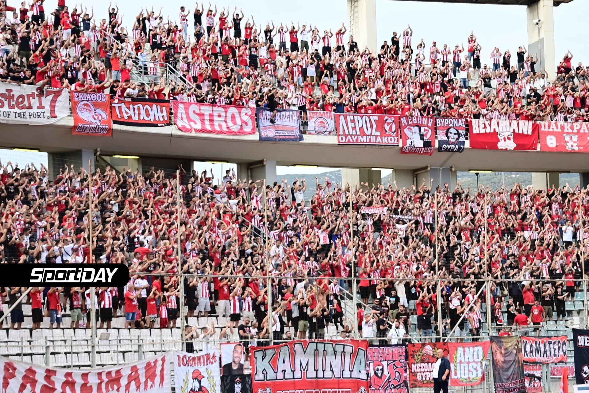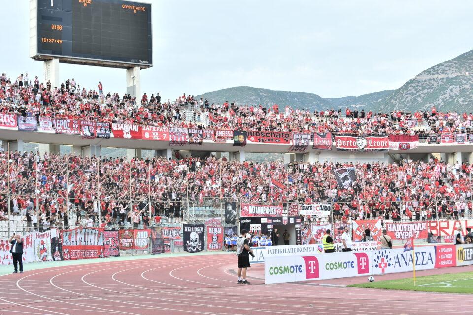 Βροντερό παρών των οπαδών του Ολυμπιακού που έχουν κατακλύσει το «Πανθεσσαλικό Στάδιο»