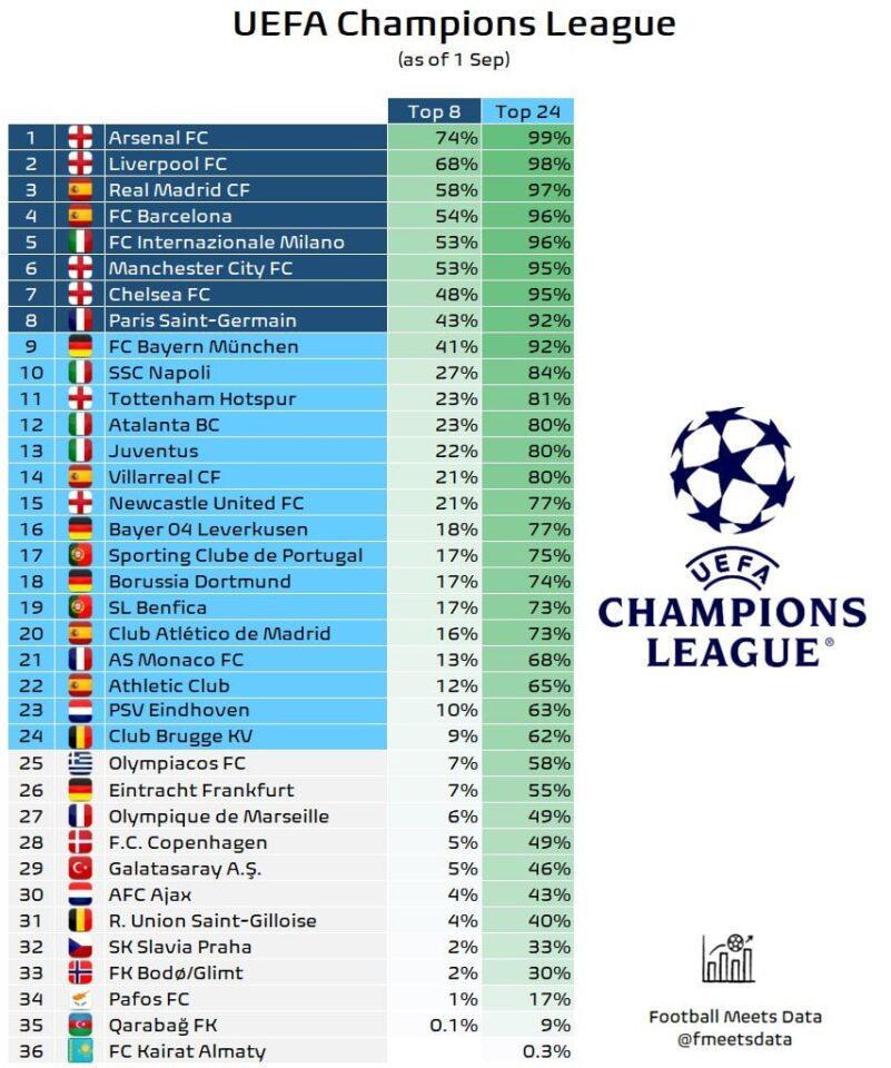 Συγκεκριμένα, η δημοσίευση παρουσιάζει τις πιθανότητες και για τις 36 ομάδες να βρεθούν στην πρώτη οκτάδα, που προκρίνεται απευθείας στην επόμενη φάση, αλλά και στην πρώτη 24άδα, όπου οι ομάδες θα παίξουν στα play offs.