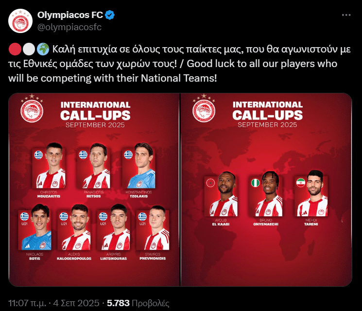 «Καλή επιτυχία σε όλους τους παίκτες μας, που θα αγωνιστούν με τις Εθνικές ομάδες των χωρών τους», έγραψαν στα σόσιαλ μίντια οι Πειραιώτες.