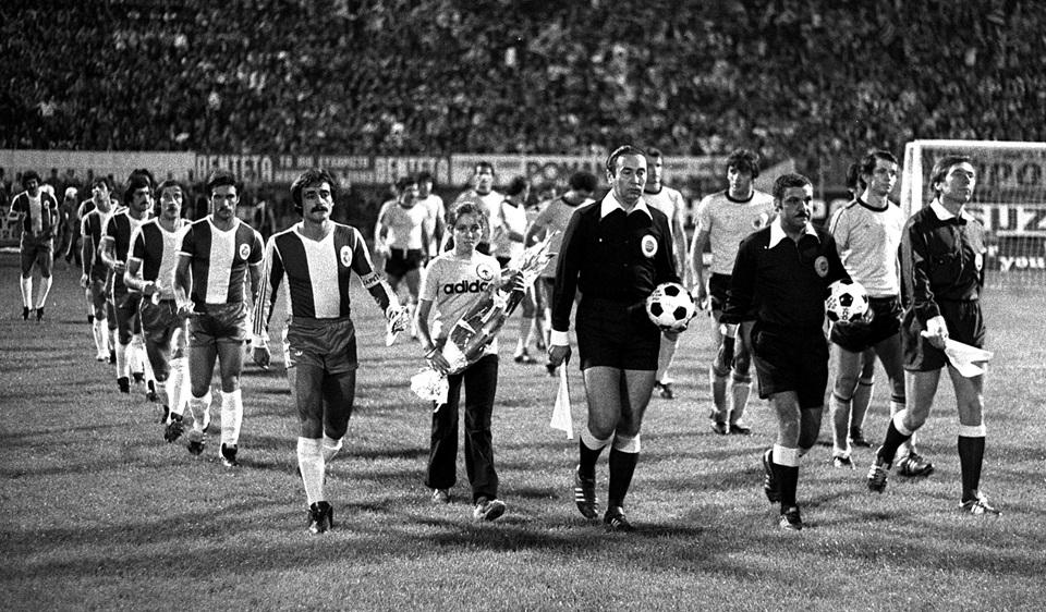 Η είσοδος των παικτών της ΑΕΚ και της Πόρτο μαζί με τους διαιτητές, το βράδυ της 13ης Σεπτεμβρίου 1978 στη Νέα Φιλαδέλφεια.