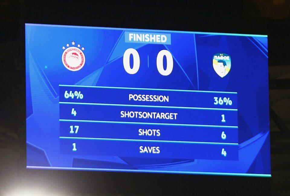 Το τελικό 0-0 αφήνει αναμφίβολα απογοήτευση στην ομάδα του Χοσέ Λουίς Μεντιλίμπαρ, καθώς η υπεροχή της δεν μετουσιώθηκε σε γκολ. Παρ’ όλα αυτά, η ένταση και η διάθεση που έδειξαν οι παίκτες του Ολυμπιακού ήταν αξιοσημείωτες, κάτι που αντικατοπτρίζεται και στα στατιστικά του αγώνα: