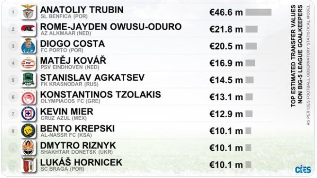 Συγκεκριμένα, σύμφωνα με το CIES (Ποδοσφαιρικό Παρατηρητήριο του Πανεπιστημίου του Νοσατέλ), ο Τζολάκης βρίσκεται στην 6η θέση της σχετικής λίστας, εκτός των κορυφαίων πέντε ευρωπαϊκών πρωταθλημάτων.
