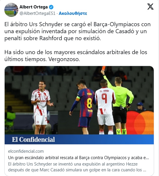 Ολυμπιακός: Ξεκάθαρη η El Confidencial για τη διαιτησία: «Μεγάλο διαιτητικό σκάνδαλο κατέστρεψε το Μπαρτσελόνα - Ολυμπιακός»