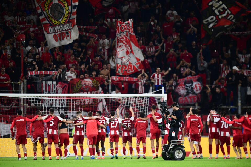 Οι παίκτες του Ολυμπιακού πανηγύρισαν τη σπουδαία νίκη επί της ΑΕΚ μαζί με τους φιλάθλους που γέμισαν το Καραϊσκάκη.