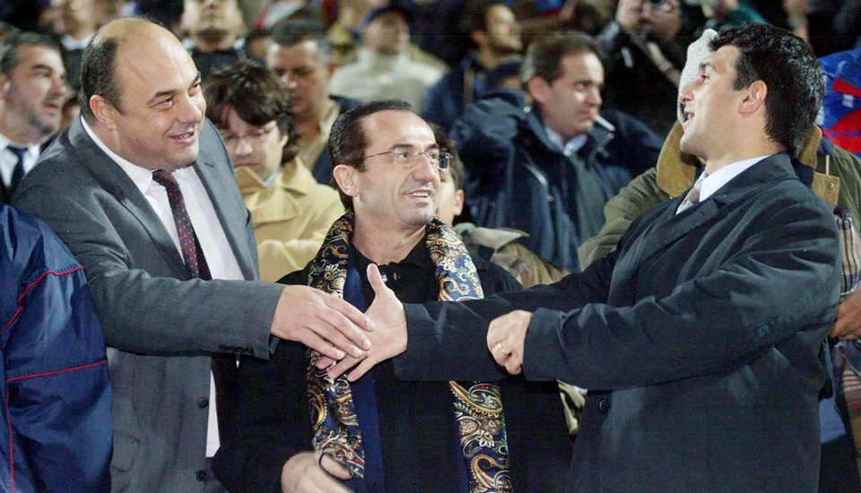 Ο Αχιλλέας Μπέος, ο οποίος έκανε τότε το γενικό κουμάντο στον Πανιώνιο χωρίς να κατέχει διοικητικό πόστο, ανταλλάσσει χειραψία με τον πρόεδρο της Μπαρτσελόνα, Ζοάν Λαπόρτα, υπό το βλέμμα του Λευτέρη Πανταζή.