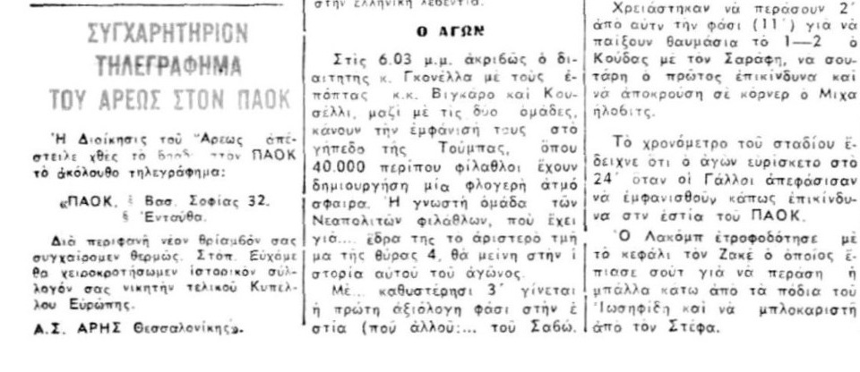 Το τηλεγράφημα, μάλιστα, δημοσιεύθηκε την επόμενη μέρα σε εμφανές σημείο της πρώτης σελίδας της εφημερίδας «Αθλητικά Νέα», την οποία εξέδιδε ο τότε πρόεδρος του Άρη, Νίκος Καμπάνης. Για να καταλάβετε πόσο διαφορετικές ήταν οι εποχές μάλιστα – αν και τότε κυβερνούσε ακόμα η Χούντα της 21ης Απριλίου 1967, που επέβαλλε την «εθνική ομοψυχία» – η εφημερίδα κυκλοφόρησε με τον εξής πηχυαίο πανηγυρικό τίτλο: «ΠΑΟΚ γιγάντιος – κατήγαγε μέγα θρίαμβο 4-0 επί της Λυών και πανηγυρικά είναι στους 8 του Κυπέλλου Κυπελλούχων»!