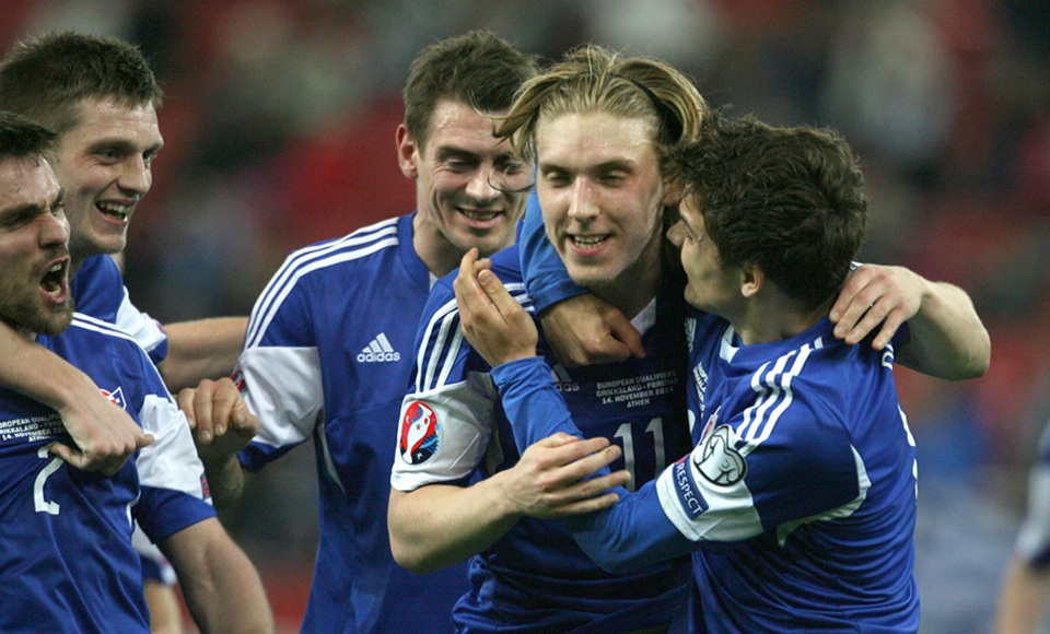 Ο Έντμουντσον (Νο 11) δέχεται τα συγχαρητήρια των υπόλοιπων παικτών των Νησιών Φερόε, λίγο μετά την επίτευξη του γκολ κόντρα στην Εθνική Ελλάδας στις 14 Νοεμβρίου 2014.