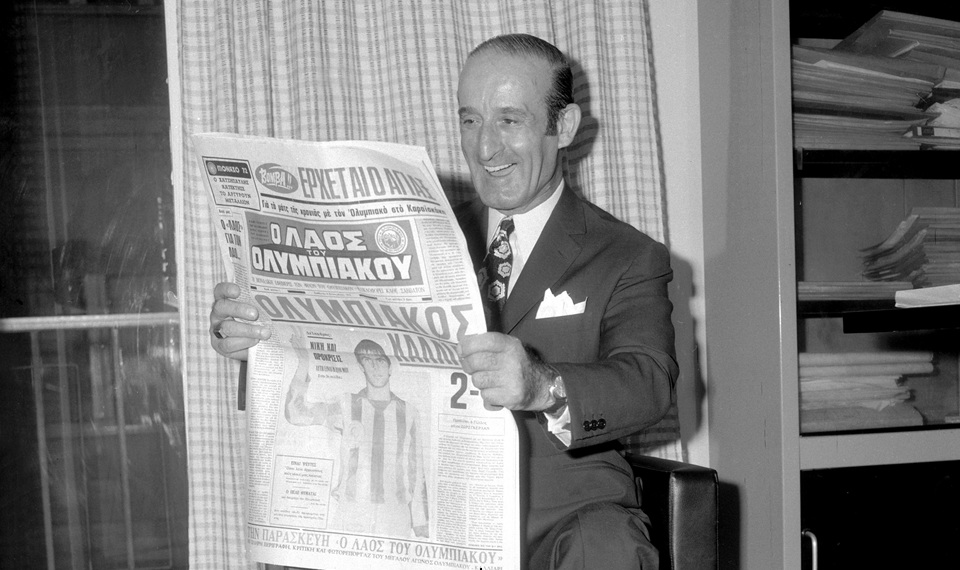 Ο Νίκος Σταυρίδης διαβάζει με ενθουσιασμό την εφημερίδα «Ο Λαός του Ολυμπιακού», σε φωτογράφιση για τις ανάγκες μιας συνέντευξης που έδωσε το φθινόπωρο 1972, όταν οι «ερυθρόλευκοι» απέκλεισαν την Κάλιαρι για το Κύπελλο ΟΥΕΦΑ.