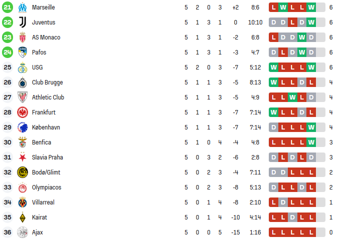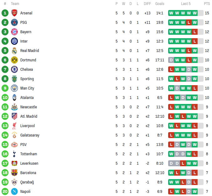 Αυτή είναι η βαθμολογία του Τσάμπιονς Λιγκ μετά την ολοκλήρωση της πέμπτης αγωνιστικής της League Phase.