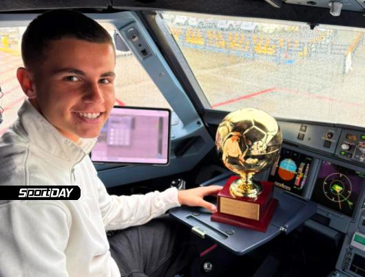 Με τα… λάφυρα επιστρέφει από το Τορίνο ο Χρήστος Μουζακίτης! Ο Ελληνας μέσος του Ολυμπιακού βραβεύτηκε με το «Golden Boy Web» από την Tuttosport και φωτογραφήθηκε με αυτό στο αεροπλάνο.