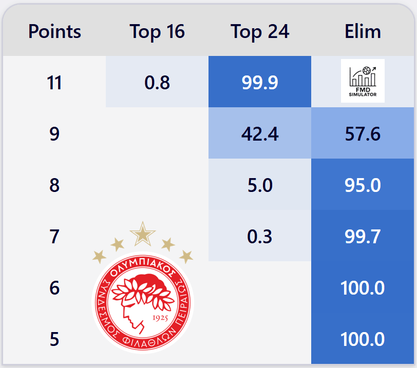 Οι Πειραιώτες έφτασαν τους 5 βαθμούς και πλέον ξέρουν πως με δύο ακόμα νίκες θα περάσουν στην επόμενη φάση του Τσάμπιονς Λιγκ. Κατά 99.9% τουλάχιστον, σύμφωνα με την ειδική πρόβλεψη του Football Meets Data.