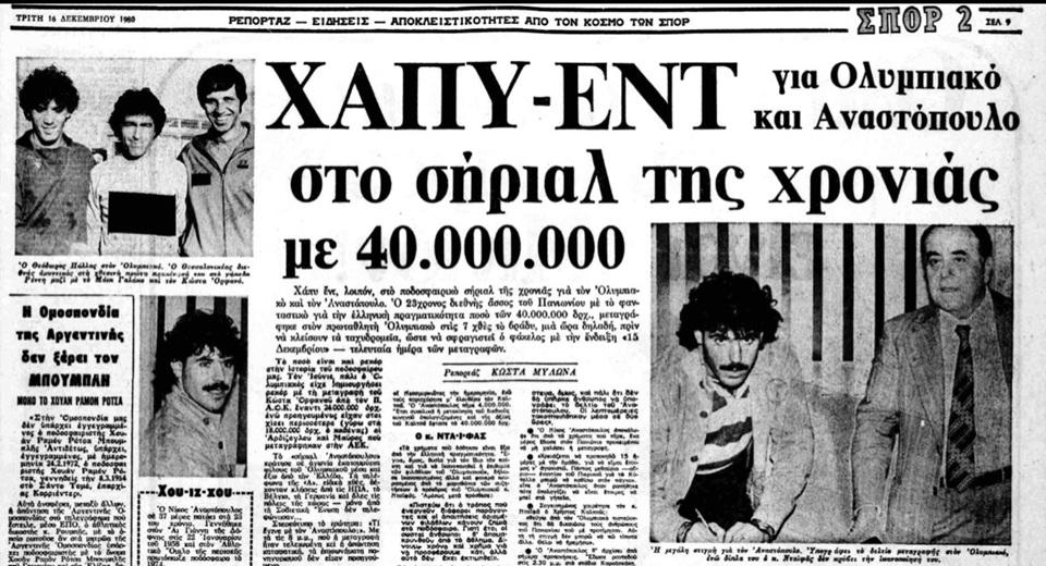 Το ρεπορτάζ του Κώστα Μυλωνά στην «Απογευματινή» της 16ης Δεκεμβρίου 1980 για τη μεταγραφή του Νίκου Αναστόπουλου στον Ολυμπιακού. Στη φωτογραφία δεξιά, ο διεθνής επιθετικός υπογράφει το συμβόλαιό του υπό το βλέμμα του Σταύρου Νταϊφά.