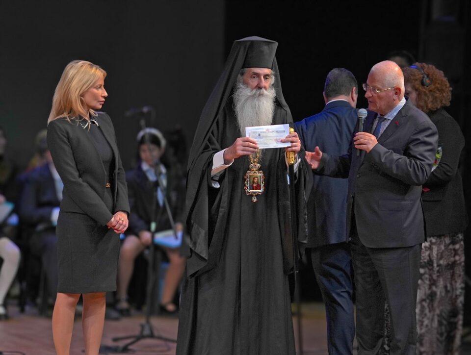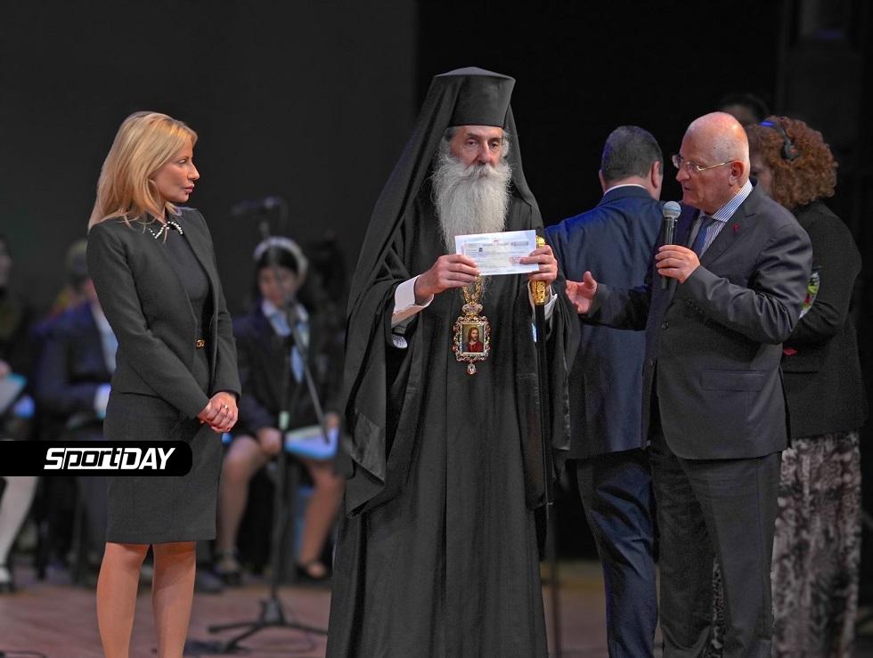 Είχε προηγηθεί η τιμητική βράβευση του νέου Καθηγουμένου της Ιεράς Μονής Αγίας Αικατερίνης Σινά, Σεβ. Αρχιεπισκόπου Σινά, Φαράν και Ραϊθώ κ. Συμεών. Ο κ. Βασίλης Βασιλειάδης, εκ μέρους του Ολυμπιακού και του κ. Μαρινάκη, πρόσφερε χρηματική επιταγή στον Αρχιεπίσκοπο Σινά κ. Συμεών για την στήριξη της Ιεράς Μονής Αγίας Αικατερίνης, καθώς και τιμητική πλακέτα, για την υπεραιωνόβια προσφορά της Ιεράς Μονής Σινά στην Ιστορία και τον Πολιτισμό, ως ελάχιστο δείγμα αναγνώρισης. «Ευχαριστώ θερμά και να σας δηλώσω ότι εκτός των άλλων στοιχείων της οικογένειάς μου, γεννήθηκα και σε οικογένεια Ολυμπιακών» ανέφερε ο νέος Αρχιεπίσκοπος Συμεών.