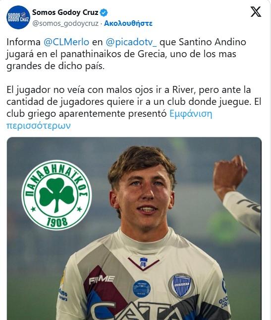 Ο Παναθηναϊκός έχει βάλει στην ατζέντα των μεταγραφών του, τον Σαντίνο Αντίνο και στην Αργεντινή αναφέρουν πως έχει μπει… σφήνα στην Ρίβερ Πλέιτ.