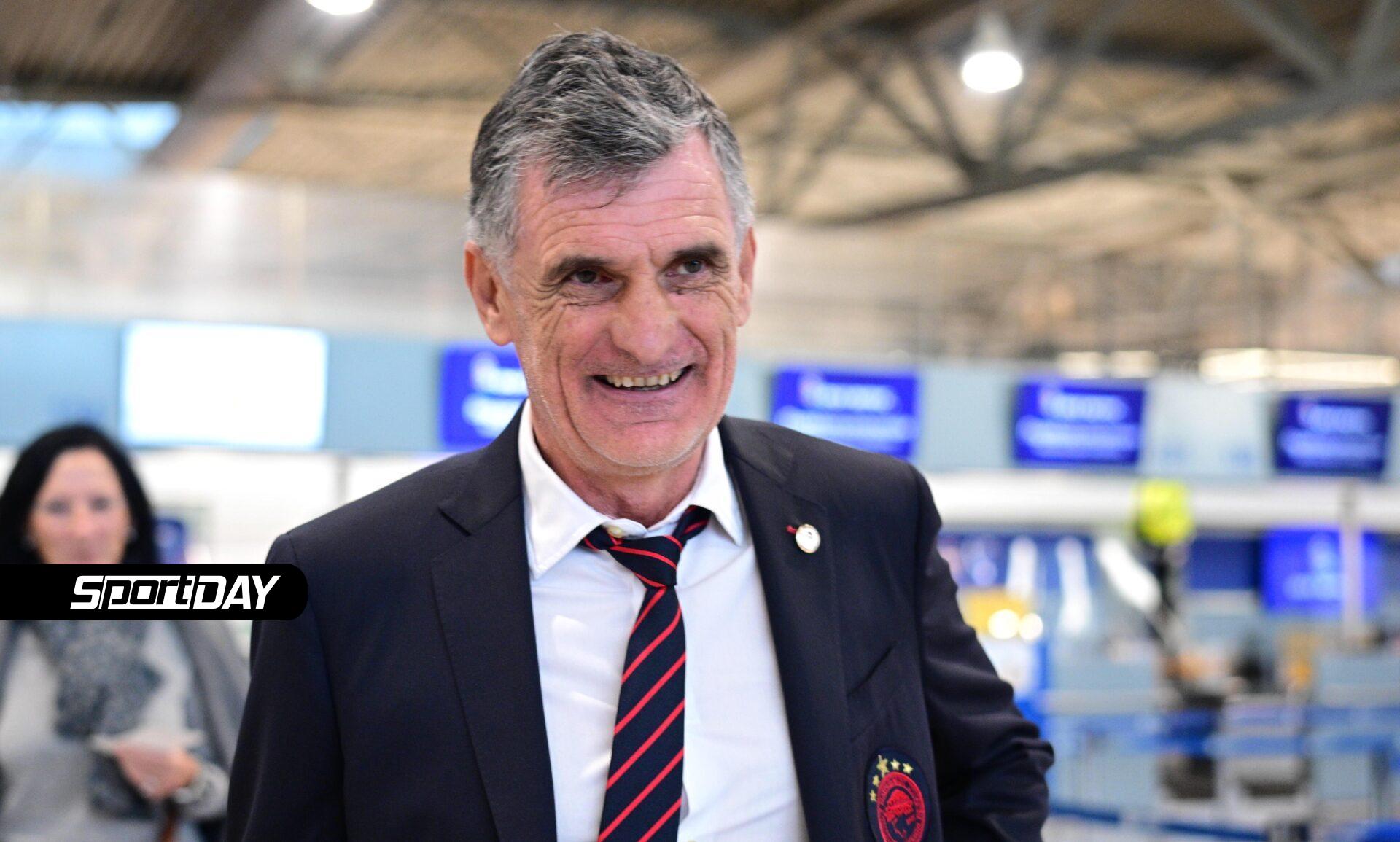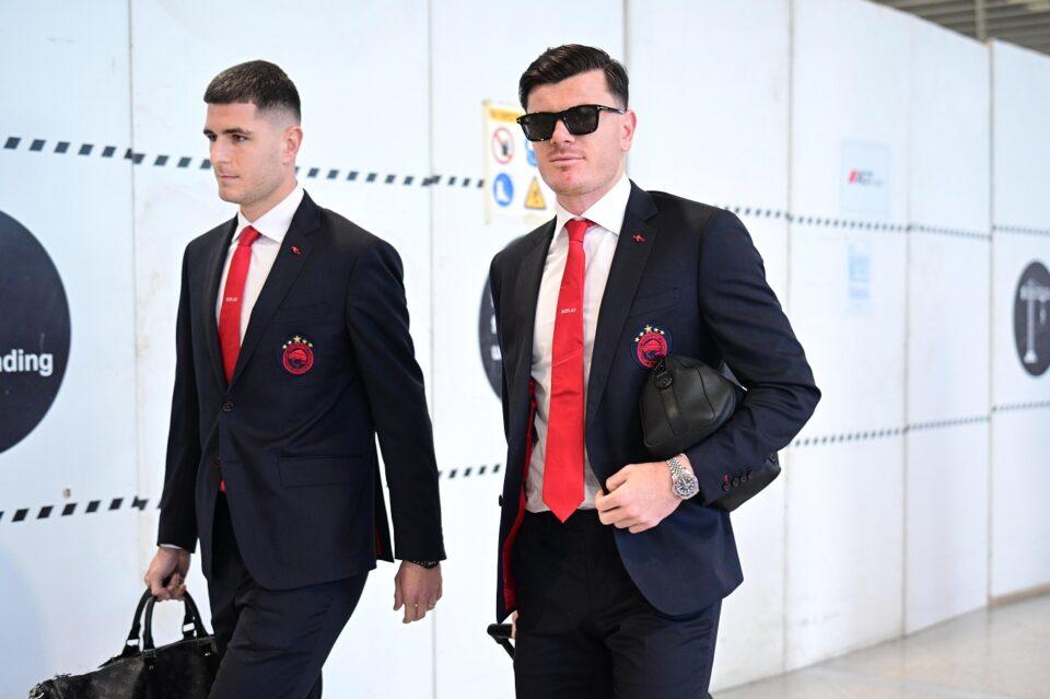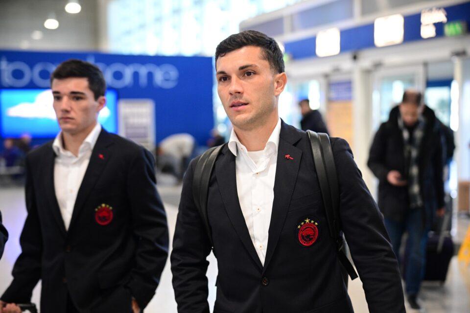 Οι ερυθρόλευκοι βρέθηκαν το πρωί στο αεροδρόμιο “Ελευθέριος Βενιζέλος” για να αναχωρήσουν με προορισμό το Άμστερνταμ. Τα φλας των φωτογράφων άστραψαν και αποτύπωσαν τα χαμογελαστά πρόσωπα της ερυθρόλευκης αποστολής, στην οποία βρίσκονται οι: