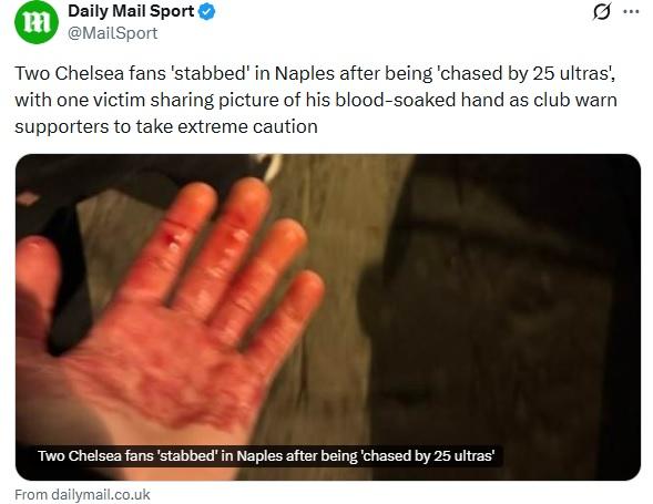 Επίθεση δέχθηκε μια ομάδα οπαδών της Τσέλσι, από 25 περίπου οπαδούς της Νάπολι, οι οποίοι τους βρήκαν έξω από ένα μπαρ. Μάλιστα κρατούσαν μαχαίρια και τραυμάτισαν δύο οπαδούς των Λονδρέζων σε μια άγρια συμπλοκή.