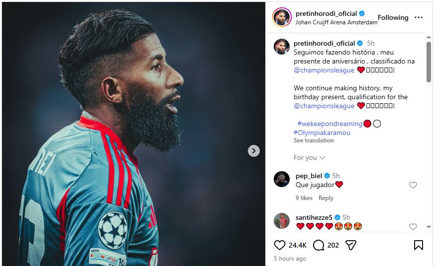 Τη χαρά του, τη μοιράστηκε και με τον κόσμο του Ολυμπιακού, σε μια ανάρτηση στον λογαριασμό του στα social media. «Συνεχίζουμε να γράφουμε ιστορία, το δώρο γενεθλίων μου είναι η πρόκριση στο Champions League», έγραψε χαρακτηριστικά.