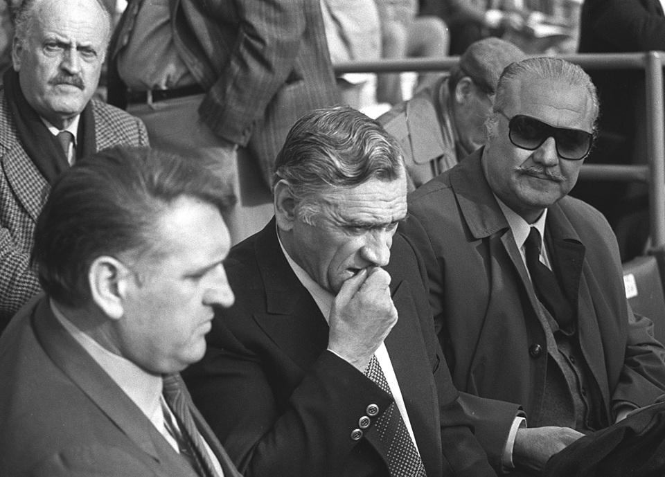 Ο Κάζιμιρ Γκόρσκι στην κερκίδα του γηπέδου του Απόλλωνα στις 30 Ιανουαρίου 1983, όπου παρακολούθησε τον αγώνα της ΑΕΚ δίπλα στους παράγοντές της. Στο βάθος, με τα μαύρα γυαλιά, διακρίνεται ο Μιχάλης Λεφάκης (πηγή: Eurokinissi).