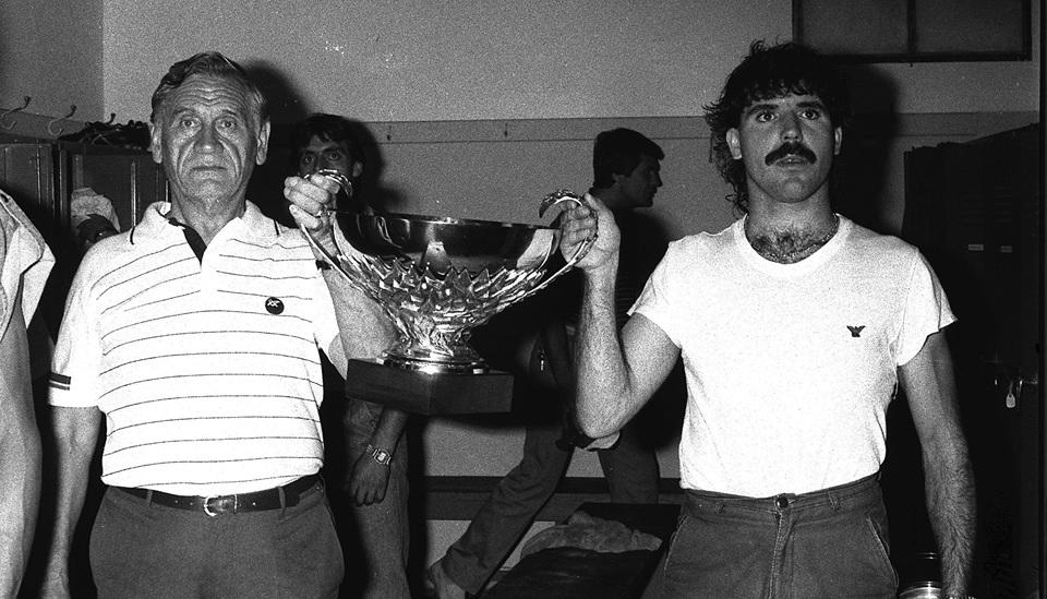 Φωτογραφία από τα επινίκια του Ολυμπιακού για την κατάκτηση του πρωταθλήματος του 1983. Ο Κάζιμιρ Γκόρσκι ποζάρει με τον Νίκο Αναστόπουλο και το τρόπαιο, στα αποδυτήρια του «Γ. Καραϊσκάκης» (πηγή: Eurokinissi).