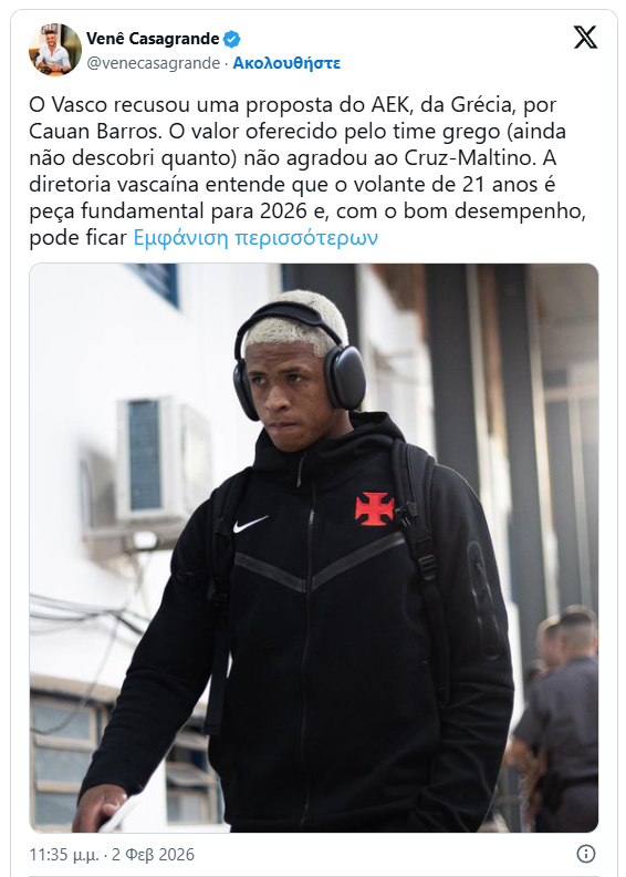 «Η Βάσκο απέρριψε προσφορά της ΑΕΚ για τον Καουάν Μπάρος. Το ποσό που προσέφερε η ελληνική ομάδα (δεν έχω μάθει ακόμη το ακριβές ποσό) δεν ικανοποίησε τη Βάσκο. Το διοικητικό συμβούλιο της Βάσκο κατανοεί ότι ο 21χρονος μέσος είναι βασικός παίκτης για το 2026 και, με καλή απόδοση, θα μπορούσε να γίνει ακόμη πιο πολύτιμος στην αγορά», αναφέρει το ρεπορτάζ στη Βραζιλία.