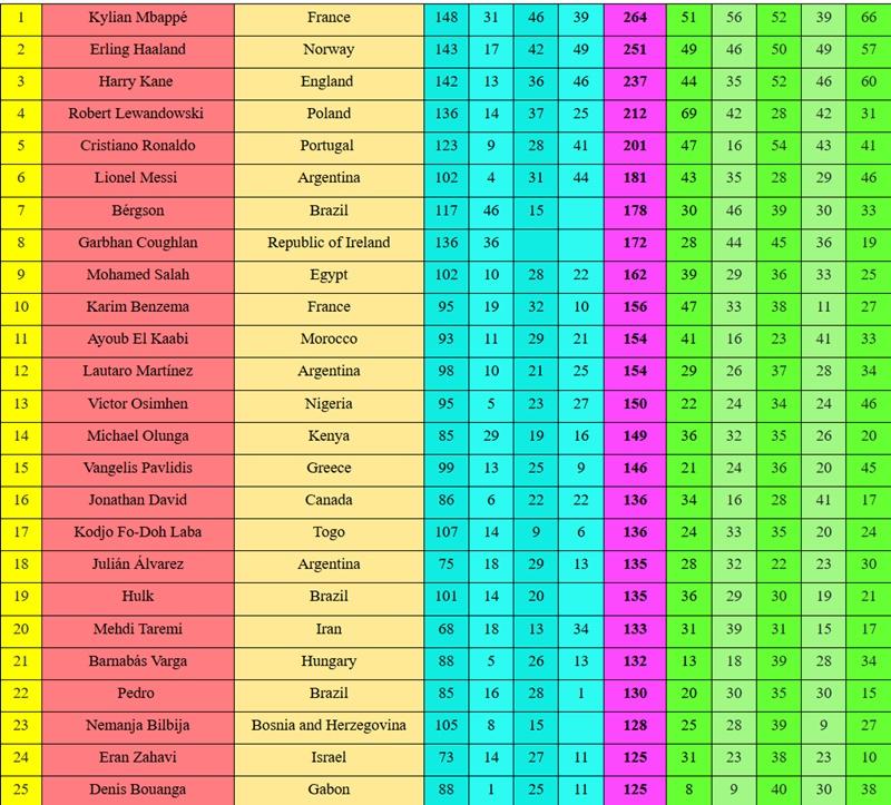 Η λίστα έχει και ελληνική εκπροσώπηση, αφού ο Βαγγέλης Παυλίδης είναι 15ος με 146 γκολ, ενώ παίκτη έχει και η ΑΕΚ: τον Μπαρνάμπας Βάργκα, που είναι 21ος με 132.