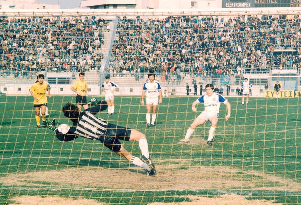 Η απόκρουση του Οικονομόπουλου στο πέναλτι του Παπούλια του Εθνικού, στις 20 Φεβρουαρίου 1989 στο παλιό Καραϊσκάκη. Δυστυχώς για τον ικανότατο τερματοφύλακα, η εκπληκτική εκείνη σεζόν δεν είχε συνέχεια (πηγή: EUROKINISSI).