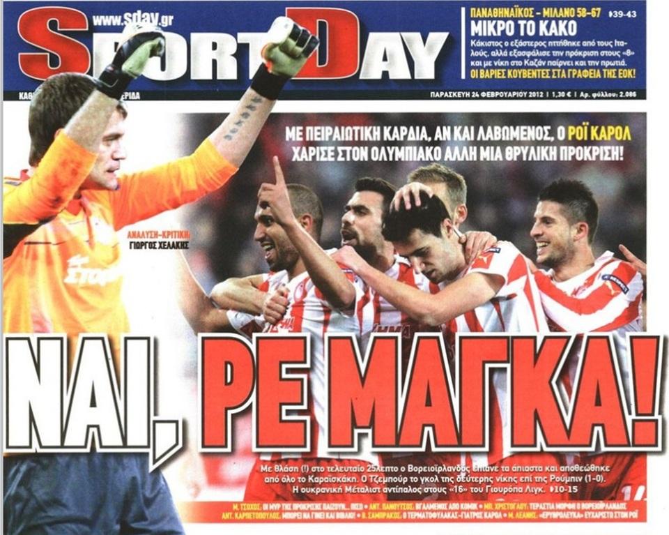 Το πρωτοσέλιδο της Sportday στις 24 Φεβρουαρίου 2012 ήταν εστιασμένο στην επική εμφάνιση του Κάρολ.