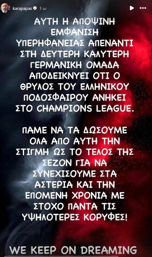 «Αυτή η αποψινή εμφάνιση υπερηφάνειας απέναντι στη δεύτερη καλύτερη γερμανική ομάδα αποδεικνύει ότι ο θρύλος του ελληνικού ποδοσφαίρου ανήκει στο Champions League. Πάμε να τα δώσουμε όλα από αυτή τη στιγμή ως το τέλος της σεζόν για να συνεχίσουμε στα αστέρια και την επόμενη χρονιά με στόχο πάντα τις υψηλότερες κορυφές. Συνεχίζουμε να ονειρευόμαστε», ανέφερε σε μήνυμά του ο εκ των αντιπροέδρων της ΠΑΕ Ολυμπιακός, στο Instagram.