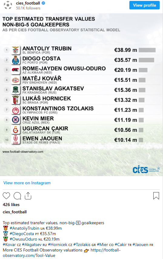 Σύμφωνα με το CIES Football Observatory, ο 23χρονος γκολκίπερ του Ολυμπιακού βρίσκεται στην 7η θέση των πιο ακριβών γκολκίπερ παγκοσμίως που αγωνίζονται εκτός των πέντε κορυφαίων ευρωπαϊκών πρωταθλημάτων