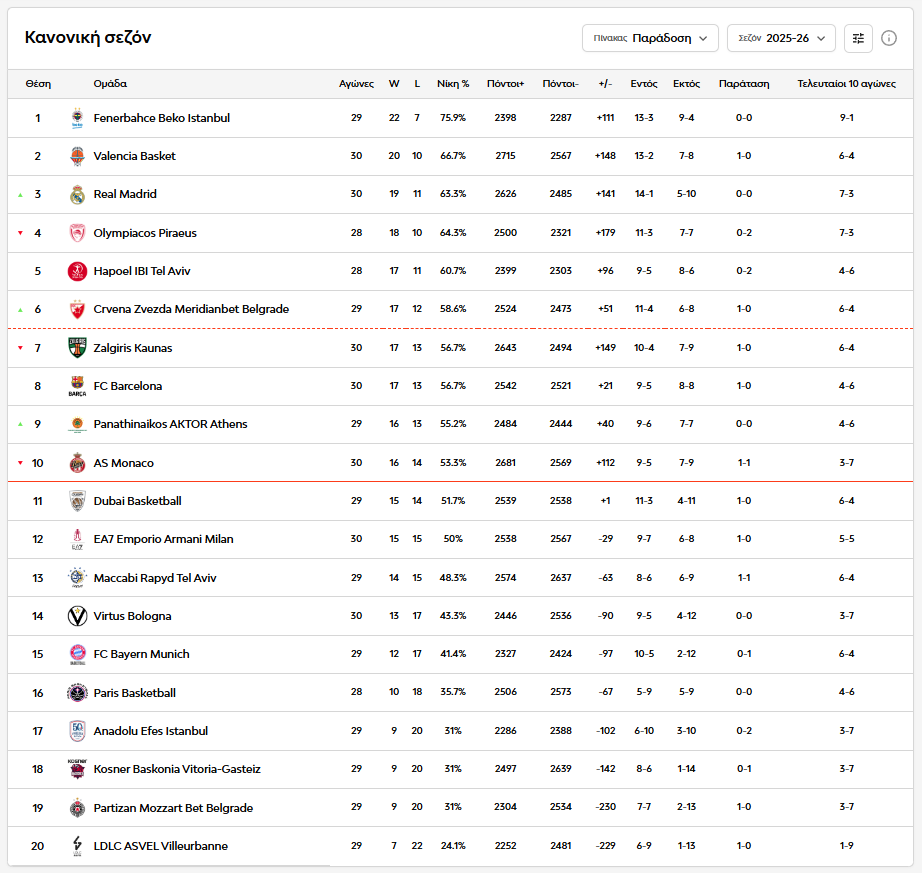 Ο Ολυμπιακός βρίσκεται στην 4η θέση με ρεκόρ 18-10 έχοντας ένα ματς λιγότερο από τη Φενέρμπαχτσε και δύο λιγότερα από τη Βαλένθια και τη Ρεάλ, ενώ ο Παναθηναϊκός είναι στην 9η θέση με ρεκόρ 16-13 και ένα ματς λιγότερο.
