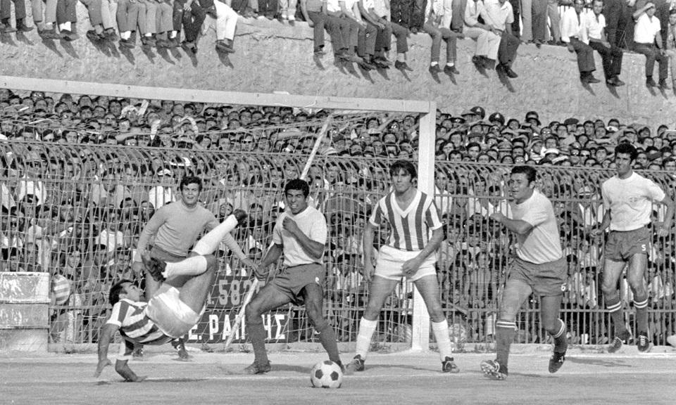 Θεαματικό στιγμιότυπο από τον αγώνα Αιγάλεω-Ολυμπιακός τον Σεπτέμβριο του 1970, όπου ο Πουπάκης ήταν ένας από τους πρωταγωνιστές της νίκης του «Σίτι» με 1-0 (πηγή: EUROKINISSI).