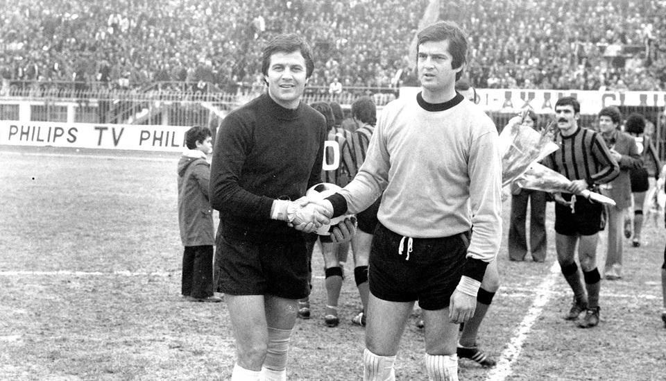 Ο Λευτέρης Πουπάκης με τον Τάκη Οικονομόπουλο πριν από τον αγώνα Παναχαϊκή-Ολυμπιακός 0-1 τον Ιανουάριο του 1977. Το θρυλικό «πουλί» αγωνιζόταν τότε στην ομάδα της Πάτρας (πηγή: EUROKINISSI).
