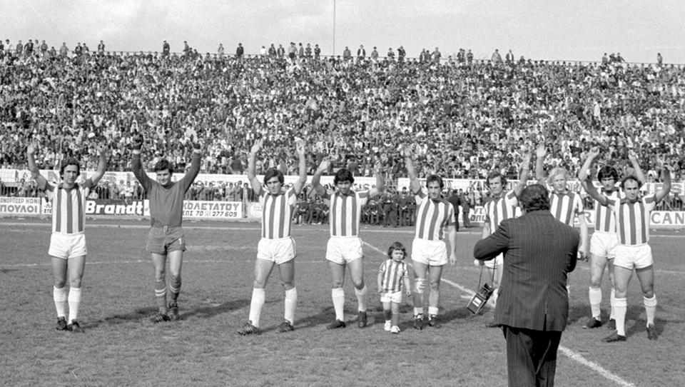 Οι παίκτες του Ολυμπιακού χαιρετούν τον κόσμο πριν την έναρξη του αγώνα Κυπέλλου της 8ης Μαρτίου 1978 στην Πάτρα. Από αριστερά διακρίνονται οι Πέτρος Καραβίτης, Λευτέρης Πουπάκης, Γιάννης Κυράστας, Νίκος Μαριόλης, Κυριάκος Ανδρούτσος, Κώστας Αϊδινίου, Ντέρεκ Σπενς, Μάκης Κατσαβάκης και Μιχάλης Κρητικόπουλος (πηγή: EUROKINISSI).