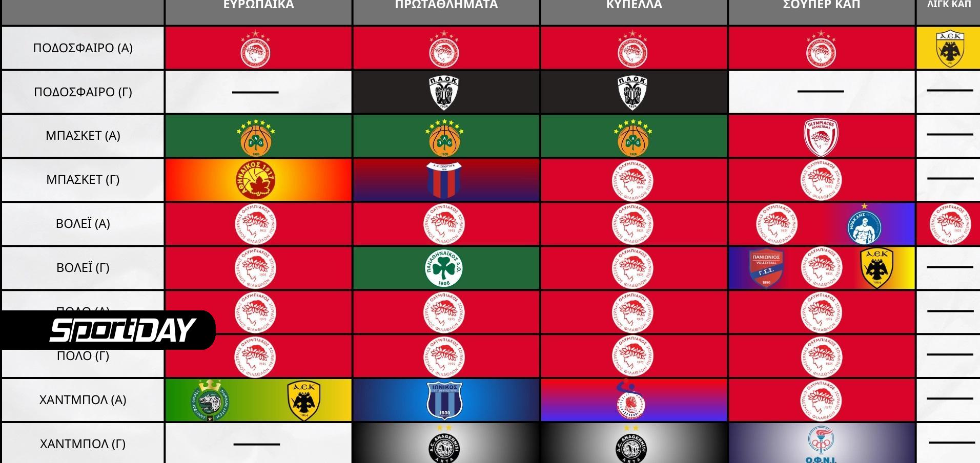 Ο πίνακας αποτυπώνει με σαφήνεια τη θέση του Ολυμπιακού στο σύνολο αυτών των διοργανώσεων και αναδεικνύει τη διαχρονική δυναμική του συλλόγου στα βασικά ομαδικά αθλήματα.