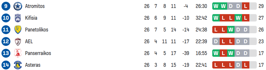 Από την άλλη, ο 9ος Ατρόμητος μπαίνει με αέρα παραμονής 12 βαθμών, ενώ διαφορά δέκα βαθμών έχει η Κηφισιά που είναι στη 10η θέση. 11ος είναι ο Παναιτωλικός, εννιά βαθμούς πάνω από τον υποβιβασμό, ενώ στο +6 από τη ζώνη είναι η ΑΕΛ.