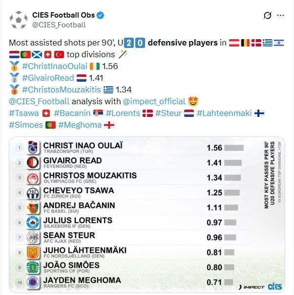 Πολλά τα ιδιαίτερα χαρακτηριστικά του με ένα ακόμα να τονίζεται από το CIES. Συγκεκριμένα, η έρευνα εστιάζει στους ποδοσφαιριστές κάτω των 20 ετών (εξαιρουμένων των επιθετικών) με τις περισσότερες πάσες-κλειδιά ανά αγώνα κατά την τρέχουσα σεζόν.