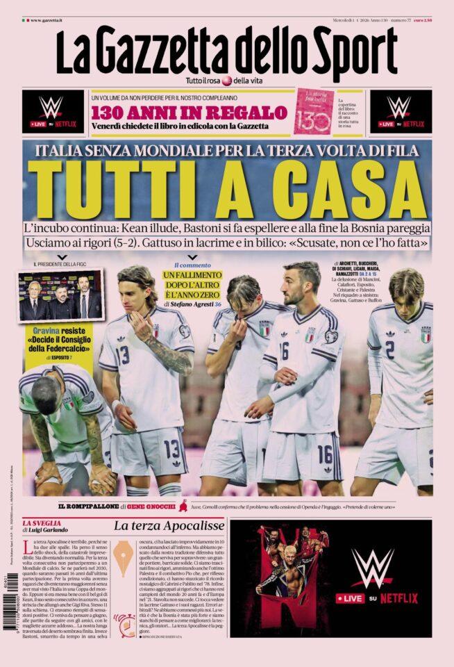 Τα ΜΜΕ στην Ιταλία έχουν πρώτο θέμα το νέο αποκλεισμό. Ακόμα και οι πολιτικές εφημερίδες έχουν κεντρικό θέμα τη νέα αποτυχία. Ο τίτλος «Tutti a casa» είναι αυτός που κυριαρχεί. Χρησιμοποιείται κυρίως σε αθλητικές αποτυχίες, όπου τονίζεται το γεγονός της μη πρόκρισης και της παραμονής στο σπίτι.