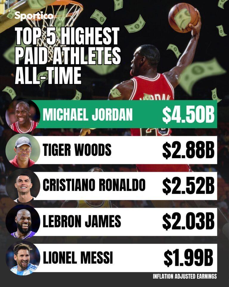 Ο Μάικλ Τζόρνταν κέρδισε περισσότερα από οποιονδήποτε εν ενεργεία ή βετεράνο αθλητή το 2025, ανεβάζοντας τα κέρδη της καριέρας του στα 3,28 δισεκατομμύρια δολάρια ή 4,5 δισεκατομμύρια δολάρια, προσαρμοσμένα στον πληθωρισμό! Ο Τζόρνταν, κέρδισε περίπου 275 εκατομμύρια δολάρια το 2025, κυρίως από τη Nike με την οποία υπέγραψε το 1984 όταν μπήκε στο NBA.