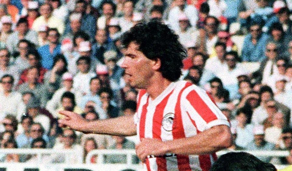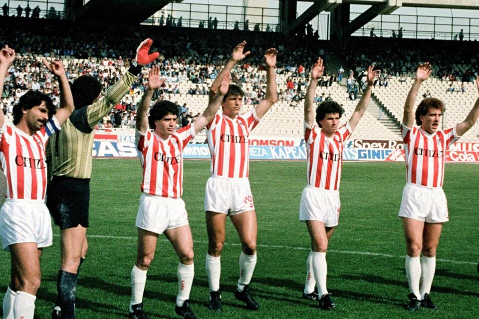 Οι παίκτες του Ολυμπιακού χαιρετούν τους φιλάθλους πριν τη σέντρα του αγώνα με τον Ηρακλή στις 5 Απριλίου 1987. Διακρίνονται από αριστερά οι Πέτρος Ξανθόπουλος, Δημήτρης Σκούνας, Θόδωρος Ζελιλίδης, Τάσος Μητρόπουλος (ο οποίος έπαιξε σέντερ μπακ εκείνη τη μέρα!), Βασίλης Χαρδαλιάς και Αλέξης Αλεξίου (πηγή: EUROKINISSI).