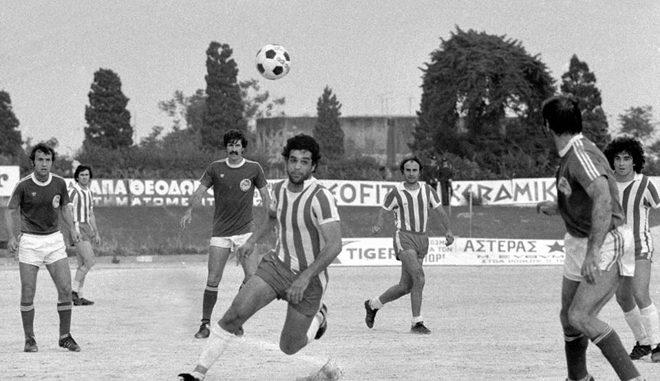 Φάση από τον πολυσυζητημένο αγώνα Ρόδος-Ολυμπιακός 3-4, στις 20 Μαΐου 1979 (οι νησιώτες κατήγγειλαν απόπειρα δωροδοκίας, που δεν αποδείχθηκε). Ο Μιχάλης Δράκος διακρίνεται πίσω από τον Σταύρο Παπαδόπουλο, που διεκδικεί την μπάλα σε πρώτο πλάνο. Αριστερά βλέπουμε τον Κώστα Παπαοικονόμου, δεξιά τους Μιχάλη Κρητικόπουλο και Ραφαέλ Περόνε, ενώ στο βάθος αριστερά διακρίνεται και ο Μάκης Κατσαβάκης (πηγή: EUROKINISSI).
