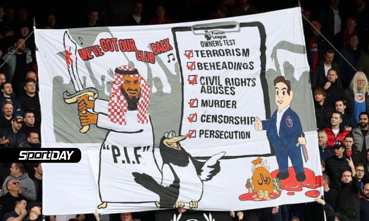 Όπως αναφέρει η «Guardian»: Οι οπαδοί των «αετών» καυτηρίασαν την έγκριση της Premier League για την εξαγορά της Νιούκαστλ από τους Σαουδάραβες, αναρτώντας πανό στο «Selhurst Park», πριν την έναρξη του αγώνα, που απεικονίζει του νέους ιδιοκτήτες του αγγλικού συλλόγου, (PIF) από τη Σαουδική Αραβία, που ετοιμάζονται να αποκεφαλίσουν μια καρακάξα 9όπως είναι το προσωνύμιο της Νιούκαστλ), ενώ το πλήθος στο βάθος τραγουδάει: «Έχουμε το κλαμπ μας πίσω».