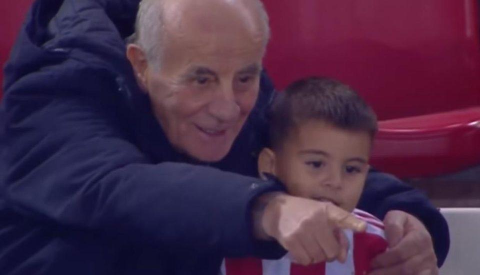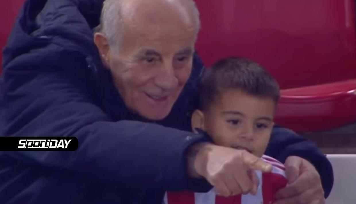 Έτσι και ο ηλικιωμένος κύριος με το μικρό παιδάκι, του οποίου δείχνει τους ποδοσφαιριστές του Ολυμπιακού και του εξηγεί το παιχνίδι!