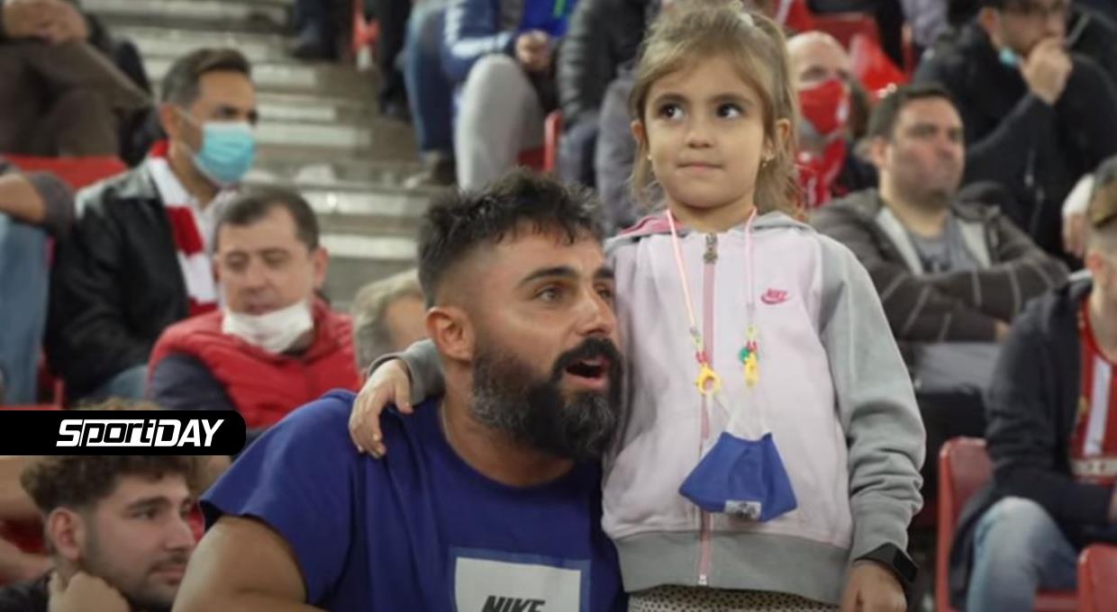 Μαζί και οι γονείς τους με την κάμερα του Olympiacos TV να καταγράφει έναν άντρα αγκαλιά με ένα μικρό κοριτσάκι να τραγουδάει σύνθημα των πειραιωτών!