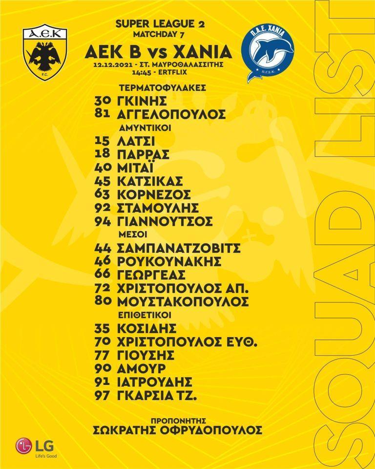 Η αποστολή της ΑΕΚ Β’ για το αυριανό παιχνίδι με τα Χανιά για την Super League 2