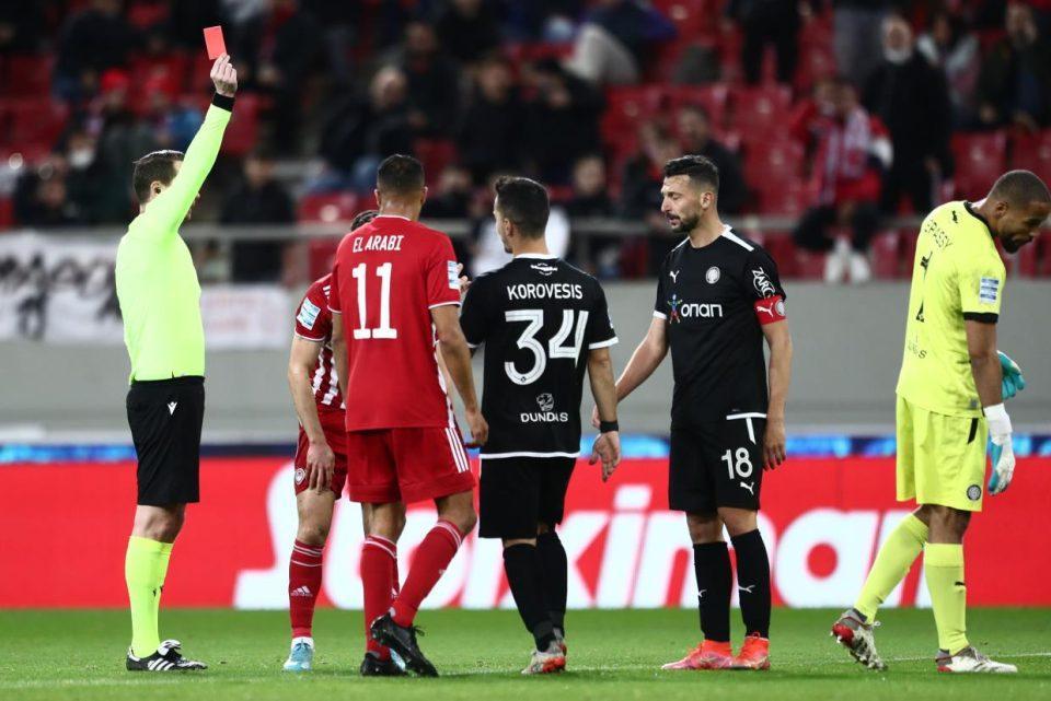 Με δέκα παίκτες αγωνίζεται ο ΟΦΗ κόντρα στον Ολυμπιακό για την 25η αγωνιστική, μετά την αποβολή του Γιαννούλη στο 71ο λεπτό.